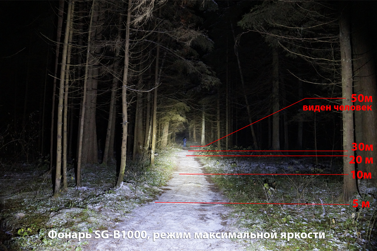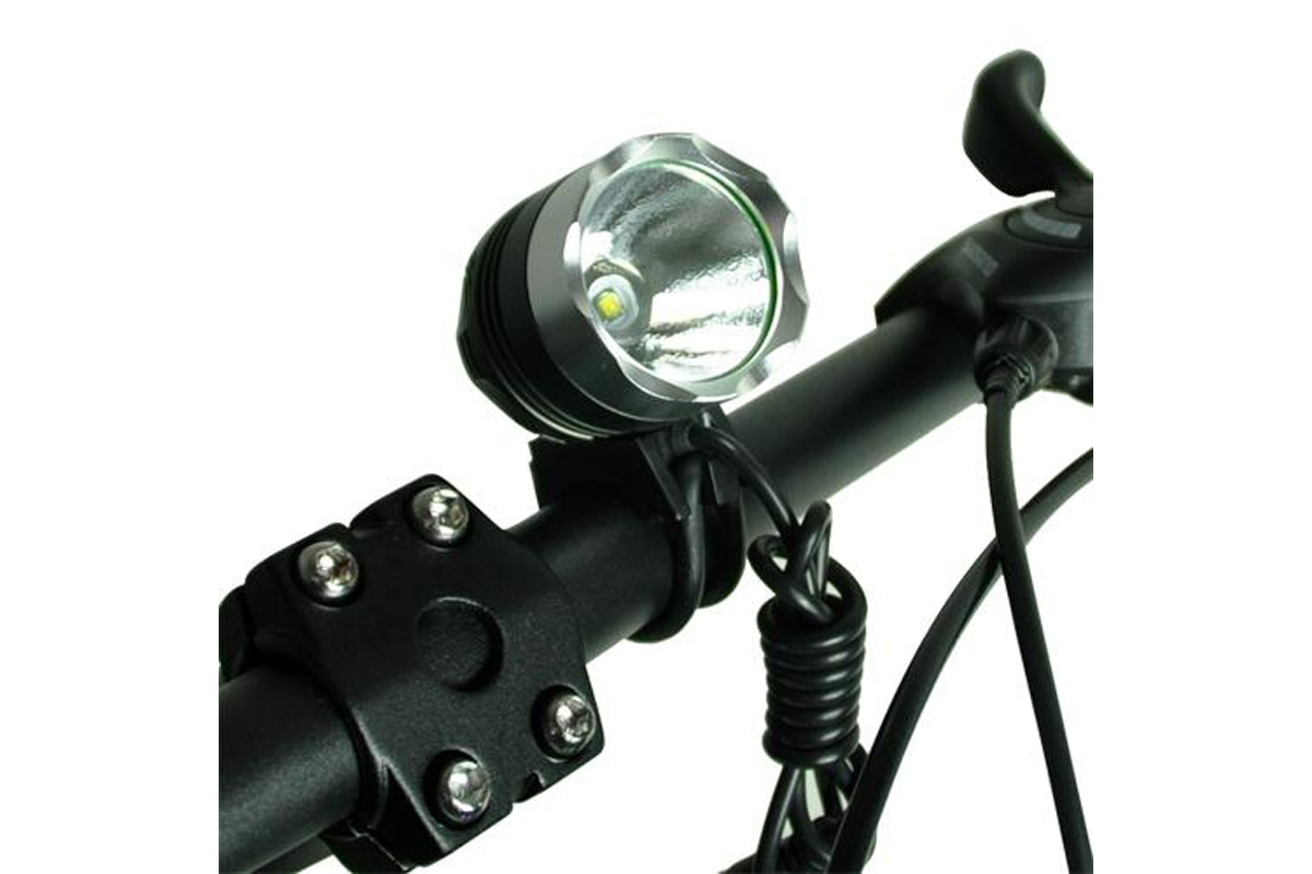Передний велосипедный фонарь SANGUAN SG-B1000 даёт мощный, хорошо сфокусированный световой поток силой 1000лм. Наилучший показатель дальности освещения. На тестовых фотографиях видно, что световой поток бьёт до 100 метров, на 50 метрах отлично виден человек. Один светодиод работает от литиевого аккумулятора 4400mAh, 8,4V. Время работы в режиме максимальной яркости - до 3 часов, в режиме слабого свечения - до 30 часов. 4 режима. Время работы светодиода "на отказ" - 50 тысяч часов. Комплект поставки: - фонарь; -аккумулятор; -зарядное устройство от сети 220В; -налобное крепление; -резиновые хомуты для крепления на руль; -инструкция. Влагоустойчивый.