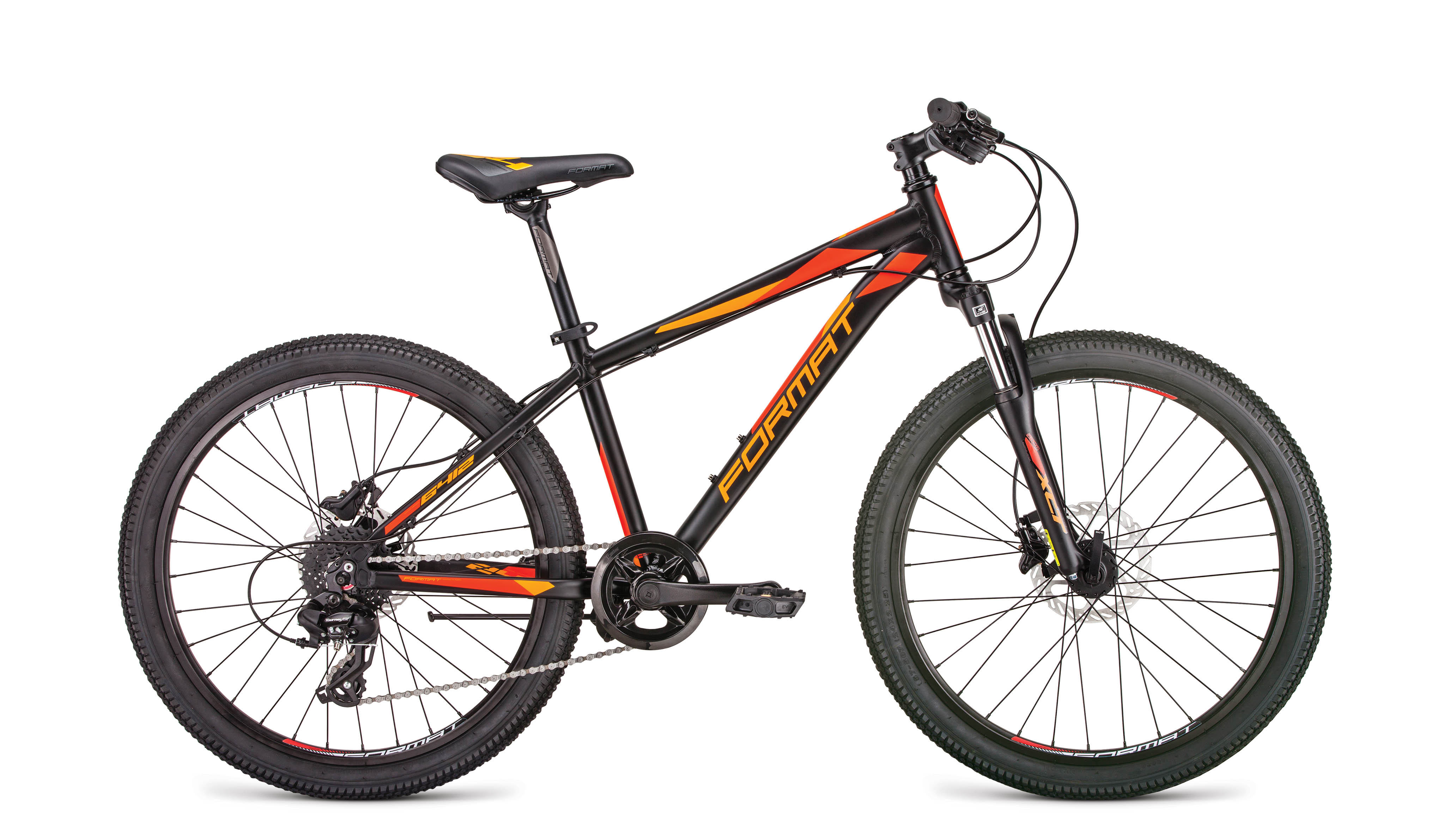 Бренд FORMAT Модель 6412 Год 2019 Серия 6412 Материал рамы Алюминий (Alloy) Рама/описание 24", Junior, алюминиевый сплав 6061 Тип вилки Амортизационная (пружина) Ход вилки, мм 50мм Блокировка амортизатора Нет Вилка/регулировки SR Suntour XCT JR 24" 50мм, пружинная, 9x100мм. Регулировка предварительной нагрузки Диаметр колес 24" Обода Format Double Wall, 32Н, Schrader Покрышки Kenda Small Block Eight, 24x2,10" Тормоза Дисковые гидравлические Тормоз X-Spark M220, 160/160мм Уровень оборудования Начальный Шифтеры Microshift SL-TS38 Переключатель задний Shimano RD-TX800 Кассета Format CS-M3008 Каретка Kenli KL-08A, картриджная Шатуны Prowheel V32PP, 32T, 152мм Количество скоростей 8 Рулевая колонка Kenli, внешние чашки, безрезьбовая, 1 1/8"x34x30 Втулка передняя Format, 9x100мм, эксцентрик Пол/возраст Мужской Втулка задняя Format, 10x135мм, эксцентрик Документы